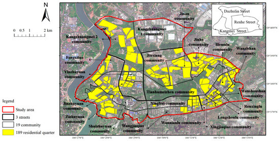 The Zhaomushan area in the Yubei District, Chongqing, China, is located at 106.5° E and 29.6° N, and the region has basically entered a stable development state. In terms of economic conditions, Dazhulin Street has the highest GDP, Renhe Street is at a moderate level, and Kangmei Street has the lowest, showing a gradient state. In terms of residents’ richness, Kangmei Street is the second public rental housing community in Chongqing, with a large number of residents and overall low income as the main characteristics, but neighboring Renhe Street and Dazhulin Street are the gathering areas of high-quality residential areas and industrial headquarters bases, with overall high income for residents. The selection of these three streets as the study area is typical. The 19 communities within the study area (actually 20, as there are no residential areas in the Kangzhuangmeidi 1 community, they will be merged with the Kangzhuangmeidi 2 community for calculation) will be used as spatial units for social–spatial differentiation research and characterization. To more accurately depict the role of basic public service facilities in social–spatial differentiation, each residential quarter within the study area will serve as a spatial unit for the study and characterization of basic public service facility differentiation (Figure 3).