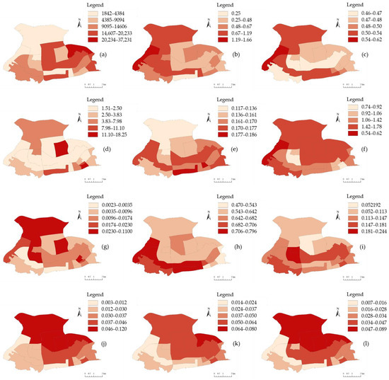 Social space: (a) Distribution of permanent population; (b) Registered residence/permanent population ratio distribution; (c) Male proportion distribution; (d) Distribution of average household size; (e) Distribution of educational levels; (f) Income level distribution; (g) Distribution of the proportion of migrant workers; (h) Distribution of the proportion of young and middle-aged labor force population; (i) Distribution of the proportion of retired population; (j) Distribution of infant population proportion; (k) Distribution of the proportion of primary school age population; (l) Distribution of the proportion of kindergarten age population.