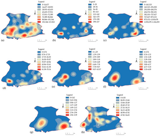 Density distribution of basic public service facilities: (a) public transportation; (b) elementary education; (c) medical hygiene; (d) culture and sports; (e) elderly care and support for the weak; (f) housing security; (g) employment and entrepreneurship; (h) park green space.