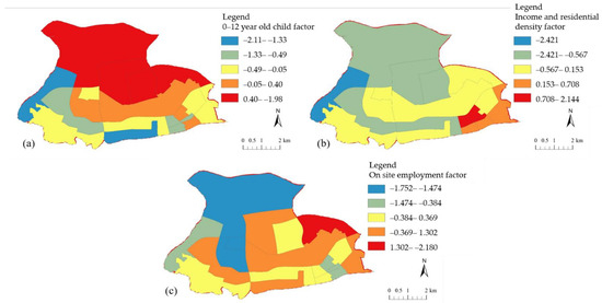 Main factors distribution of social–spatial differentiation: (a) Children aged 0–12; (b) Income and residential density; (c) On-site employment.