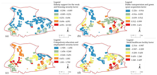 Main factors distribution of the differentiation of basic public service facilities: (a) Elderly care support and housing security; (b) Public transportation and green space acquisition; (c) Education and employment security; (d) Small healthcare facility.
