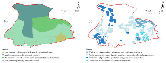Cluster calculation divides the social space of the study area into four types of social areas (Figure 8a): non-child population settlement area, migrant population settlement area, local employment and children settlement area, low-income population settlement and high-density settlement area, which respectively contain 8, 3, 3, and 5 spatial units (i.e., community). The basic public service facilities in the study area are also divided into four types of social zones (Figure 8b): dense areas of public transportation and park green space, weak areas of public transportation and green space acquisition, weak areas of compulsory education and employment security, and dense areas of small medical and health facilities, which respectively include 81, 45, 28, and 35 spatial units (i.e., residential quarter). The spatial distribution of the four types of social zones based on social–spatial differentiation shows a continuous distribution feature, while different “hot and cold regions” appear inside. This indicates that similar social groups have clustering and differentiation characteristics in the region, and there is still a further differentiation trend in the differentiated social space. The four types of social zones based on the differentiation of basic public service facilities are roughly distributed in contiguous areas, but there are a small number of “isolated” and “mixed” social zones.
