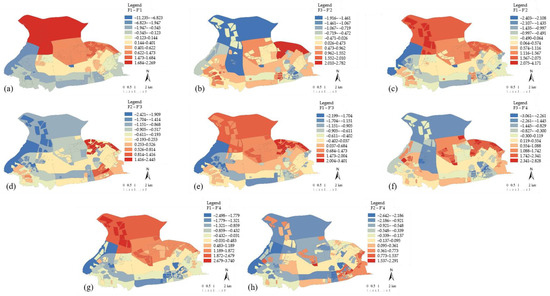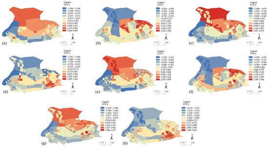 Identification of Misalignment Points between Basic Public Service Facilities and Social Space: (a) factor for children aged 0–12 (F1) and factor for elderly care and housing security (F′1); (b) on-site employment factor (F3) and elderly care support and housing security factor (F′2); (c) 0–12-year-old children factor (F1) and public transportation and green space acquisition factor (F′2); (d) income and residential density factor (F2) and public transportation and green space acquisition factor (F′3); (e) 0–12-year-old children factor (F1) and compulsory education and employment security factor (F′3); (f) on-site employment factor (F3) and compulsory education and employment security factor (F′4); (g) children aged 0–12 (F1) and small healthcare facilities (F′4); (h) income and residential density factor (F2) and small healthcare facility factor (F′4).