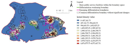 For example, after overlaying the boundaries of public transportation and park green areas, the boundaries between the original on-site employment, children’s settlements, and migrant workers’ settlements are weakened, indicating that public transportation and park green services provide the possibility for the transfer of short-term migrant workers. Services located on the weakened boundaries can provide the possibility for residents on both sides of the boundary to have contact. However, the configuration of basic public service facilities can also create new differentiation boundaries in social space, such as in non-children’s settlements on the southwest and southeast sides. The difference in public transportation and park green space services leads to new internal differentiation, exacerbating the possibility of social–spatial differentiation. In addition, calculations have found that in the boundary space (which is actually a strip space with a certain width, with a buffer zone of 50 m as the width and 25 m as the strip space), basic public service facilities are massively clustered in the weakened and newly added boundary areas, indicating a strong correlation between the distribution of weakened and newly added boundaries in local social space and the configuration of basic public service facilities (Figure 11).