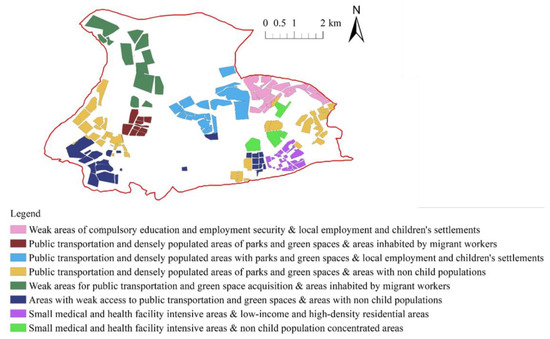 Among them, the basic public service facilities and social space adaptation area includes two types: public transportation and park green space intensive areas for the non-child population and public transportation and park green space intensive areas for migrant workers. The mismatch between basic public service facilities and social space includes two types: areas with weak compulsory education and employment security, areas with local employment and children’s settlements, areas with weak access to public transportation and green spaces, and areas with concentrated migrant workers. The new division of social space includes two types of contiguous gathering areas: public transportation, densely populated parks and green spaces, areas for local employment and children’s settlements, and areas with weak access to public transportation and green spaces, areas for non-children’s populations. The abnormal integration areas of the new social space zoning include two types: dense public transportation and park green spaces, low-income and high-density residential areas, dense public transportation and park green spaces, and non-children’s residential areas. Overall, under the influence of the configuration of basic spatial service facilities, social–spatial differentiation has begun to take on a multicenter and composite form around the main public service facilities.
