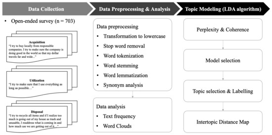 In this study, LDA is employed to analyze consumer attitudes and behaviors in the realm of CnSR. This approach allows us to uncover patterns and themes across different stages of consumption. We utilized the “gensim” library in Python, a widely recognized toolkit for its comprehensive range of topic modeling algorithms [25]. This was executed in the Google Colab computational environment. The forthcoming sections systematically delineate the procedural steps followed.