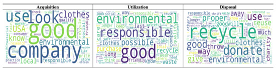 After the initial preprocessing, a text frequency analysis was conducted to comprehend the frequency distribution of words associated with CnSR by each consumption stage using the “collections” module in Python’s standard library. Table 1 lists the top 20 keywords derived from the frequency analysis. In a concise summary, the predominant keywords for the acquisition stage included “good”, “company”, “look”, and “use”. For the utilization stage, the leading terms were “good”, “responsible”, “environmental”, and “purchase”. Lastly, for the disposal stage, the most frequent terms encompassed “recycle”, “donate”, “good”, “use”, and “environmental”.