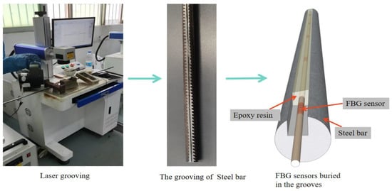 The model experimental system includes a model tank to fill soil and piles, a temperature-controlled circulation system, and a measurement system, as shown in Figure 1. The outside and top of the model tank (2.5 m in length, 2.5 m in width, and 2.0 m in height) are laminated with a 5 cm thick insulation material. The temperature-controlled circulation system consists of a cooling machine, heating machine, water pump, water tank, and circulating fluid. The temperature range of the heating machine was 20–120 °C, and that of the cooling machine was 5–35 °C; both have a control accuracy of 0.1 °C. The water temperature in the control chamber could be precisely controlled by operating the control panel. The temperature in the piles and soil were measured through thermocouples, and the soil pressure and pore water pressure in the soil surrounding the piles were also measured. FBG was selected for the strain measurement of piles. FBG data acquisition were completed by the FBG acquisition instrument produced by NanZee Sensing Technology, which can accurately output the wavelength change of FBG. After the reinforcement steel used in piles is laser grooved, the FBG sensors are embedded in the reinforcement steel of the pile and encapsulated with epoxy resin, as shown in Figure 2.