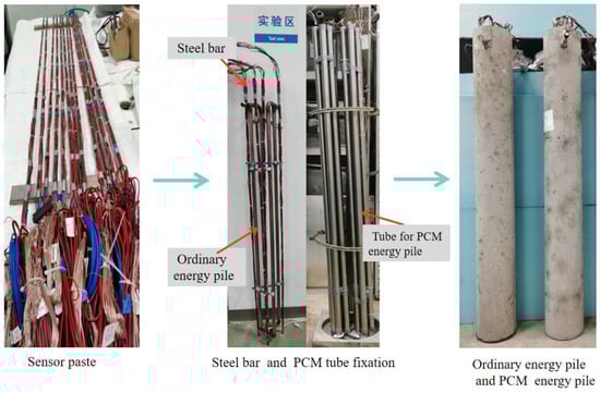 Two model piles were tested in the experiment to make a comparison. One was an ordinary concrete pile without PCM, and the other was a PCM energy pile in which 20 tubes (22 mm in diameter, 1.5 mm in thickness, made of stainless steel) filled with PCM were bonded to the steel in the pile. The concrete mixes for the two types of energy piles are shown in Table 1. The cross sections of the PCM pile and ordinary pile are shown in Figure 3. The two piles had the same dimensions: a diameter of 200 mm and a length of 1500 mm. Each pile was arranged with four steel bars (green in Figure 3) of 8 mm in diameter to fix the FBG strain sensors and temperature sensors. Each model pile contained a parallel, double-U-shaped heat exchange tube with a diameter of 20 mm (see color in Figure 3). A small amount of steel fiber was added to the PCM pile to improve the heat exchange. When making the PCM pile, sensors were first attached to the reinforcement steel bar; then, the steel bar and PCM tubes (yellow color in Figure 3) were fixed to the double U-shaped heat exchange tube, and finally, the steel bar, PCM tubes, and heat exchange tubes were placed together in a PVC mold. The prepared steel fiber concrete was poured into the PCV mold to form the pile. The same steps were followed to create an ordinary concrete pile. The process of making the energy piles is shown in Figure 4.