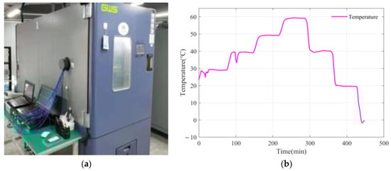 FBG temperature calibration experimental device and temperature change during testing; (a) Test chamber; (b) Temperature change in the calibration test.