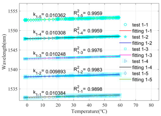 The temperature calibration experiments used the high- and low-temperature test chamber produced by Guangzhou-GWS Environmental Equipment Co., Ltd. (Guangzhou, China) for the temperature calibration of the optical fibers, as shown in Figure 7a. The temperature measurement range of the chamber was −40 to +150 °C. Before the temperature calibration tests, a bare fiber with five measurement points was placed in the test chamber. The temperature in the test chamber was monitored using a thermocouple. In the tests, the temperature in the chamber first rose to 60 °C and then decreased to 0 °C, as shown in Figure 7b. The wavelength range of the five measurement points of the bare fiber in the calibration experiment was 1533–1553 nm. Therefore, =0.01110 nm/°C is the average value of the theoretical calculation of the sensor sensitivity coefficient. Figure 8 shows the linear fit curve for the temperature characteristics of the FBG for the calibration experiment. It can be seen that the FBG sensor exhibits a well-fitted linear relationship from 0 to 60 °C. However, = 0.01021 nm/°C is the average value of the sensitivity factor obtained from the test, as listed in Table 2. Compared with the typical value, the actual measured value was 8% smaller, indicating that temperature calibration of the FBG is essential.
