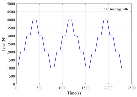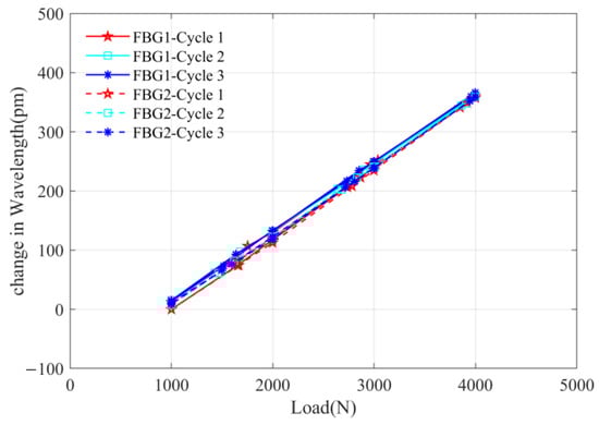 Figure 10 shows the loading path for the experiment with three cycles of loading and unloading. The loading path is 1 kN-2 kN-3 kN-4 kN, and then it is gradually discharged in reverse. The grating wavelength variation data and tensioner loading data were plotted according to three loading and unloading cycles, as shown in Figure 11. It can be observed that the central wavelength of the FBG increases as it is loaded and decreases as it is unloaded. It is consistent with the theoretical increase in the wavelength of the grating under tension and the decrease in the wavelength under pressure. Moreover, it can be seen that the wavelength change and load vary linearly over the three cycles of the test. Figure 12 shows the relationship between the wavelength change and strain. The sensitivity coefficient of FBG1 is 1.1773 pm/°C, and the theoretical value is 1.1778 pm/°C, with a difference of 0.04%. The fitted correlation coefficient is 0.9988. The sensitivity coefficient of FBG2 is 1.18 pm/°C, and the theoretical value is 1.1856 pm/°C, with a difference of 0.4%. The fitted correlation coefficient is 0.9995. This indicates that the experimental measurement coefficients and the typical values are almost the same. Figure 13 shows a comparison between the FBG strain measurements and the strain gauge measurements. The FBG strain measurement and strain gauge measurement are very close to the typical values, further supporting that = 0.78 can be used as the sensitivity of the strain fiber.