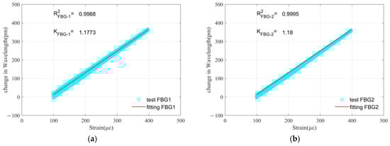 Wavelength variation with strain change; (a) FBG1; (b) FBG2.