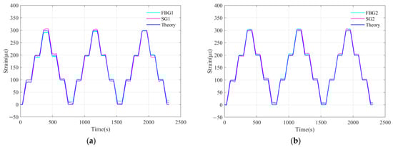 Comparison of strain measurement between FBG and strain gauges: (a) FBG1 and ERS1; (b) FBG2 and ERS2.
