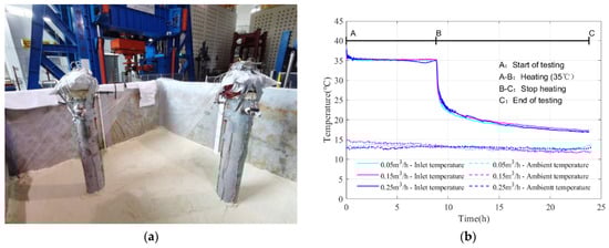 The tests were conducted on the PCM pile and the ordinary pile simultaneously, buried in saturated sand with a relative density of 60%. A small amount of silica was added to standard sand. The particle sizes are shown in Table 3. The maximum dry density of the used sand was 1.713 g/cm3, and the minimum dry density was 1.442 g/cm3. The sand was filled into the model tank layer by layer. A total of 15 layers were compacted to achieve the same soil density in each layer (Figure 15a). After each layer of filling was completed, samples were taken to calculate the density of the sand. The aim is to control the compactness of the soil in each layer at the designed relative density of 60%. The influence of the flow rate was investigated by running three different flow rates of 0.05 m3/h, 0.15 m3/h, and 0.25 m3/h. Approximately 9 h of heating and 15 h of recovery were performed with an inlet water temperature of 35 °C at the three flow rates. The average room temperature during the three flow conditions (0–24 h) was similar, at approximately 13 °C. However, when operating the 0.15 m3/h flow condition, a little variation of approximately 2 °C in room temperature was observed, with a variation compared to the other two conditions throughout the process, as shown in Figure 16b. In the stage of B-C in Figure 15b, flow is stopped for recovery.
