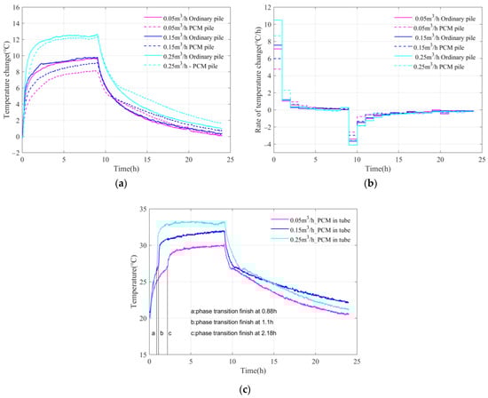 Figure 16a shows the temperature variation curves of the ordinary and PCM piles under different flow conditions, which represent the average temperature variation of the pile. For both the PCM pile and the ordinary pile, it was observed that the magnitude of temperature change increased with the increase in flow rates. Additionally, the temperature changed differently between the ordinary and PCM piles under the same flow condition. At the end of heating, the temperature increased by 8.1 °C for the PCM pile and 9.7 °C for the ordinary pile under the low flow condition of 0.05 m3/h, while the temperature increased by 12.2 °C for the PCM pile and 12.6 °C for the ordinary pile under the high flow condition of 0.25 m3/h. To gain a deeper understanding of the temperature variation rate of the pile during different stages of the heating transfer, the temperature change amplitude per hour, which represents the difference between two adjacent hours, was plotted and illustrated in Figure 16b. By analyzing the temperature change rate over time, valuable insights can be obtained regarding the dynamic changes in the pile’s temperature during the heating process. The maximum rate can be seen during 0–1 h, while the pile temperature variation rate was almost zero during 4–9 h. Figure 16c shows the temperature variation of the phase change material in the pile under different working conditions. It can be observed that the smaller the flow rate, the longer it took for the PCM to complete the phase change process, with 2.18 h under the 0.05 m3/h, 1.1 h for the 0.15 m3/h, and 0.88 h for the 0.25 m3/h working conditions, respectively. Furthermore, the PCM utilized in this experiment is an industrial-grade paraffin wax, and when the temperature reaches 24 °C, it initiates the phase change process. The phase transition interval for the PCM occurs within the range of 24–27 °C during the heating process.