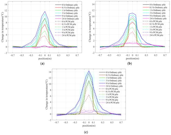 Figure 17 presents the radial temperature changes inside and outside the pile at 0, 0.5, 1, 3, 9, and 24 h at a burial depth of 0.775 m for both the ordinary and PCM piles under different working conditions. The position 0 in the coordinates indicates the center of the pile. During the heating process, the soil temperature around both the ordinary and PCM piles gradually increased, but slower than the pile temperature. The thermal resistance of the soil leads to a gradual decrease in soil temperature as the radial distance from the heat source increases. Comparing the different flow conditions of the ordinary pile, it can be seen that there is a faster and larger temperature rise in the pile at a relatively high flow rate of 0.25 m3/h compared to the other two flow conditions, with temperature changes of 13.5 °C, 14.1 °C, and 14.4 °C at 1, 3, and 9 h, respectively. In the pile center position, the temperature difference was only 0.9 °C from 1 h to 9 h, showing that the temperature change in the pile body was particularly small during the heating process after 1 h. This indicates that the heat exchange between the heat transfer fluid and the pile body gradually decreased. A relatively good heat exchange was still maintained under the other two flow conditions from 1 h to 3 h. Similar performance was observed for the PCM pile as well.