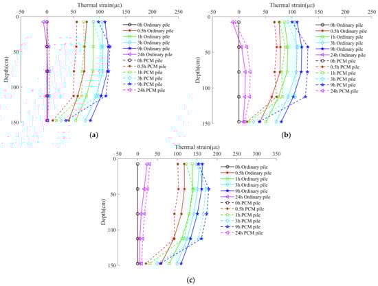 The result in Figure 19 shows that the thermal strain at the bottom of the pile was the lowest for two main reasons: first, the temperature at the bottom of the pile was lower owing to the fact that heat was mainly transferred radially through the pile; second, the bottom of the pile was restrained at the pile tip. Under all three conditions, the PCM pile exhibited a different thermal strain in the 0–1 h and 3–9 h periods than the ordinary pile. This is mainly due to the fact that the PCM pile exerted its phase change at 0–1 h and the pile temperature changed slowly to a small extent.