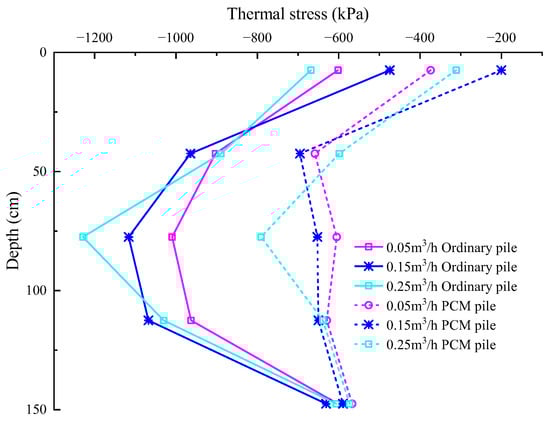 where is the strain measured by the FBG sensors; is the thermal expansion coefficient of the pile, which is measured to be 12.05 με/°C for the ordinary pile and 12.49 με/°C for the PCM pile; It is important to highlight that the thermal expansion coefficients of the energy piles were determined through unconstrained laboratory tests. During these tests, the energy piles were enveloped by a 5 cm thick insulation material, ensuring nearly uniform temperatures across all locations of the piles. is the elasticity modulus of the pile, which is tested to be 32.77 GPa for the ordinary pile and 37.48 GPa for the PCM pile; is the amount of temperature change; and is the thermal stress. Figure 20 shows the axial thermal stresses at the end of heating (9 h) under different flow conditions. The negative values represent compressive stresses. It is clear that heating caused additional axial compressive stresses inside the pile, with the values being small at the top and bottom and large in the middle. The thermal stresses in the ordinary and PCM piles increased with the rise of the flow rate. Under the high flow condition of 0.25 m3/h, the maximum axial thermal stresses reached 1228.8 kPa in the ordinary pile and 792.5 kPa in the PCM pile at the middle part of the pile. The maximum axial thermal stress in the ordinary pile was 0.55 times higher than that in the PCM pile. This implies that less thermal stress on the pile occurred when using the PCM.