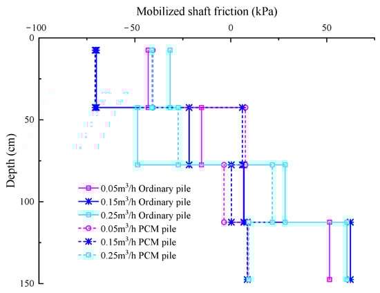 Based on calculations, the ordinary pile exhibits frictional pile behavior when not subjected to a temperature load, with the self-weight being lower than the shaft resistance. However, the introduction of a temperature load causes thermal expansion of the pile body, leading to a relative displacement between the pile and soil, resulting in negative friction resistance and the appearance of a neutral point. As depicted in Figure 21 at the flow condition of 0.15 m3/h, the maximum positive frictional resistance on the side of the ordinary energy pile is measured to be 62 kPa, which is below the standard value of the ultimate lateral resistance. Furthermore, it is observed that the bottom of the ordinary pile bears a portion of the load. But the total load accounts for only approximately 27% of the ultimate bearing capacity (including shaft resistance and tip resistance), ensuring structural safety under the temperature load of the ordinary pile. Similarly, the total load carried by the PCM energy pile is only 19.3% of the ultimate bearing capacity due to the small pile displacement. This finding indicates that the safety factor of the PCM energy pile is higher compared to that of the ordinary energy pile.