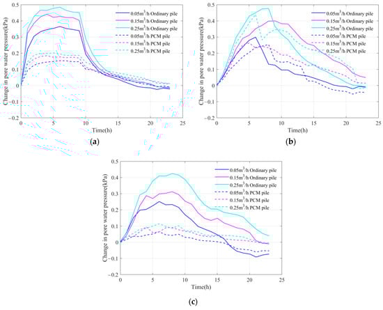 Figure 23 shows the time history of pore pressure at different locations around the ordinary and PCM piles under three different flow conditions. As shown in Figure 23a, at a depth of 112.5 cm and 0 D (XU2/PU2 in Figure 6b) from the pile side (D is the pile diameter of 20 cm, 0 D means 0 mm from the surface of the pile), the maximal pore pressure variation of the ordinary and PCM piles under 0.05 m3/h working conditions was 0.153 kPa and 0.365 kPa, respectively, while the maximal pore pressure variation of the ordinary and PCM piles under 0.25 m3/h working conditions was 0.2 kPa and 0.485 kPa, respectively. Obviously, the pore pressure variation in the soil around the PCM pile was smaller than that in the soil around the ordinary pile. Figure 23b,c show the pore pressure variation curves at a depth of 112.5 cm and 0.5 D (XU3/PU3 in Figure 6b) from the side of the pile and at depths of 160 cm and 0.5 D from the bottom of the pile, respectively. A similar trend that pore pressure changed more obviously around the ordinary pile was observed from the figures. The change in pore water pressure had an influence on the effective stress in the soil, which was detrimental to soil stability. The PCM pile had the advantage of reducing the pore pressure change owing to the smaller change in temperature of the surrounding soil compared to the ordinary pile.