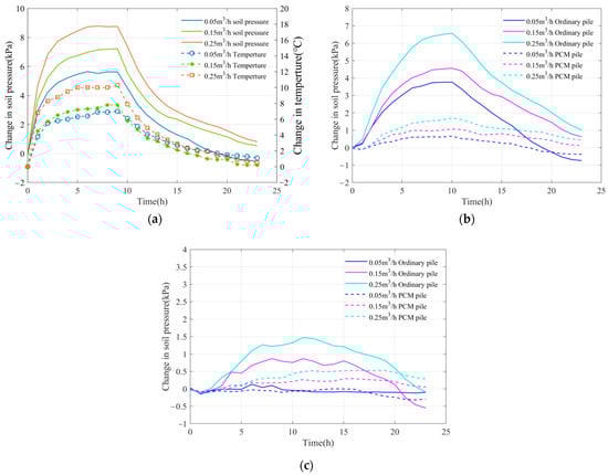 The soil pressure around the pile significantly contributed to the pile friction and pile bearing capacity. In the experiment, soil pressure sensors were installed at a depth of 112.5 cm at 0 D (XS2/PS2 in Figure 6b), 0.5 D (XS3/PS3 in Figure 6b), and 1 D (XS4/PS4 in Figure 6b) from the pile to measure the lateral soil pressure variation. However, the soil pressure sensor at the 0 D position on the surface of the PCM energy pile was damaged. Figure 24 shows the variation in soil pressure at different radial distances from the pile. As can be seen in Figure 24a–c, the higher the flow rate, the greater the change in soil pressure. The magnitude of the soil pressure change in the lateral direction decreased with increasing radial distance. This change is similar to the study of Wang et al. [35]. From Figure 24b, it can be seen that the maximal soil pressure under the small flow of 0.05 m3/h was 3.77 kPa for the ordinary pile and 0.66 kPa for the PCM pile. The soil pressure variation around the PCM pile was only 17.5% of that around the ordinary energy pile. Under a high flow of 0.25 m3/h, the maximum change in soil pressure was 6.57 kPa for the ordinary pile and 1.7 kPa for the PCM pile. The soil pressure variation around the PCM energy pile was 25.8% of that at the ordinary energy pile. In general, under the same flow conditions, the thermal stress of the soil around the PCM pile was far less than that around the ordinary pile.