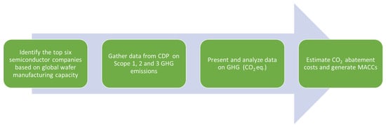 The methodology used in this work is outlined in Figure 2. In the initial steps, the Scope 1, 2, and 3 emissions data were gathered from CDP for the top six semiconductor companies. The top six semiconductor companies were selected based on the global wafer manufacturing capacities of these companies in 2020. The emissions data were then analyzed to estimate CO2 abatement cost and marginal abatement cost curves (MACCs) were developed for each company.