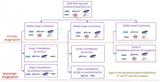 Despite the absence of country-specific disaggregated data in the CDP database by individual fabrication and assembly facilities, two layers of data disaggregation do exist, as illustrated in Figure 5. In the first layer, the global CO2 emissions data were divided into three categories: Scope 1, 2, and 3 emissions. In the second layer, the emissions data were further divided by region (Scope 1 and 2), pollutant category (Scope 1), fabrication vs. assembly emissions (Scope 2), or emission category (Scope 3), as shown in Figure 5.