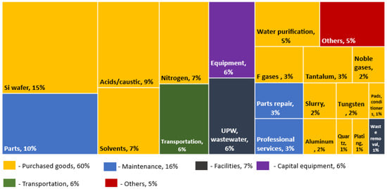 For semiconductor manufacturing, the Scope 3 emissions share was found to be as much as 42% in 2022. Scope 3 emissions could be more than 1/3 of a semiconductor manufacturing facility’s emissions. Purchased goods category including silicon wafers, process gases (nitrogen, hydrogen, silane, etc.), metals (gold, aluminum, copper, etc.), chemicals (photoresists, solvents, epoxies, acids, etc.), ultrapure water, etc., together accounted for nearly 61% of total Scope 3 emissions as shown in Figure 6 [27]. A separate analysis by Mckinsey Inc. also revealed a similar finding that the share of purchased goods category within Scope 3 could be as high as 60% of total Scope 3 emissions as shown in Figure 7 [28]. The remaining 40% of Scope 3 emissions could be attributed to equipment maintenance (16%), facilities (7%), capital equipment (6%), and others (5%).