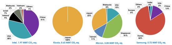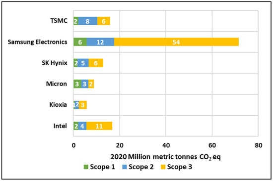 In this work, GHG emissions data of six semiconductor manufacturing companies were gathered from the publicly accessible Carbon Disclosure Project’s (CDP) website for 2020. The six companies considered in this study were Samsung Electronics, TSMC, Micron, SK Hynix, Kioxia, and Intel, which together possessed nearly 58% of the global wafer manufacturing capacity in 2020. The analysis presented in this work revealed that Samsung Electronics had the highest CO2 eq. emissions of all the six considered companies at a value of 71.6 MMT in 2020—approximately 4 to 12 times, on average, higher than the other companies—while Kioxia had the lowest CO2 eq. emissions at 3.4 MMT.