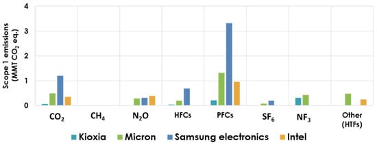 The Scope 1 emissions profile was dominated by PFCs at an average share of 45% within total Scope 1 emissions, followed by CO2 (16%), NF3 (15%), N2O (9%), other HTFs (7%), HFCs (6%), and SF6 (2%). One of the reasons why PFCs dominated CO2 eq. emissions could be their extremely high global warming potentials—approximately 6290–11,100 times that of CO2, and with long lifetimes in the atmosphere (2000–50,000 years) [34]. PFCs are synthetic chemicals such as CF4, C2F6, C3F8, C4F8, C5F8, NF3, and SF6; they have unique properties of hydrophobicity and oleophobicity, so they are used as etching gases to etch submicron circuit patterns on metal and dielectric layers of ICs [35]. They are also used to clean internal chambers of chemical vapor deposition equipment. Analysis of CDP data of Kioxia, Micron, Samsung Electronics, and Intel revealed that Samsung Electronics had the largest share of PFC emissions at 57%, and Kioxia had the lowest share at 4%, as shown in Figure 9. Micron and Intel also possessed considerable total PFC emission shares at 23% and 16%, respectively.