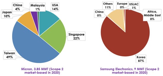 As stated earlier, the manufacturing facility location can considerably affect GHG emissions, particularly Scope 2 emissions (because of electricity and steam), as the electricity grid mix can differ considerably from country to country. Out of the six companies considered, only Micron and Samsung Electronics provided a breakdown of Scope 2 emissions (market based) within the CDP data, as depicted in Figure 11. For Samsung Electronics, most of the market-based Scope 2 emissions (87%) were attributed to South Korea, likely because the location of the company’s facilities in that region led to the purchase of electricity and other utilities in the same region. This trend was similar to that observed for Scope 1 emissions as shown earlier in Figure 8. However, most of Micron’s Scope 2 emissions (market based) were attributed to countries aside from the United States, such as Taiwan (49%), Singapore (22%), Japan (10%), and China (4%). Only a minor share was attributed to the United States (14%), which was similar to the share of Micron’s scope 1 emissions (15%), as shown earlier in Figure 10. One of the reasons for lower Scope 2 emissions in the U.S. could be due to more advanced energy markets and the high availability of renewable energy products compared to other countries.
