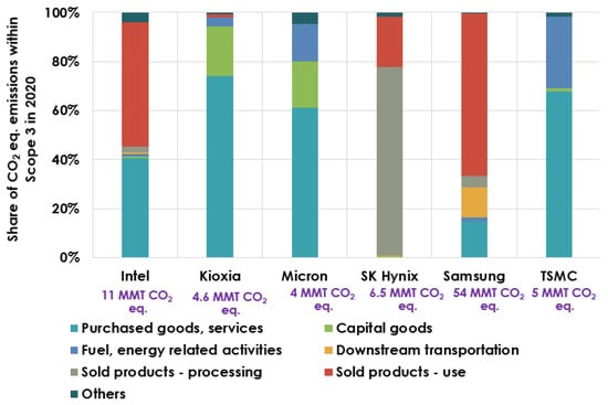 Kioxia, Micron, and TSMC did not report emissions related to the processing of sold products because their products were not directly sold as finished end products and were classified as intermediate products. The data regarding these emissions for these companies was unknown. Their products are sold to other downstream companies that perform further product processing before the final sale. Similarly, Micron and TSMC also did not report the emissions within the use phase category of Scope 3 emissions alluding to factors such as lack of data and stating that their products are not directly sold as end products but are sold to other downstream companies for further processing before final sale. It should be noted that the omission of these emissions conforms with the Greenhouse gas’ Scope 3 guidance Corporate Value Chain (Scope 3) Accounting and Reporting Standard [12] that states that if the companies are unable to estimate emissions within the following four Scope 3 categories of downstream transportation and distribution, sold products processing, sold products end use, and end-of-life treatment of sold products, the companies may exclude them if proper justification was to be provided. Since these products were classified as intermediate products. Since the emissions data were not available for the companies, the companies excluded them. Typically, Scope 3 emissions determination can be a challenging task because of its fragmented nature across the supply chain, data reliability and accuracy, standardized methodologies, uncertainties, and privacy issues in supplier data and estimation of carbon intensities of the products [37].