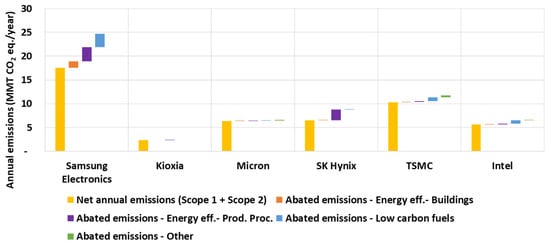 The growth of the information and communication technology sector has vastly accelerated in recent decades because of advancements in digitalization and Artificial Intelligence (AI). Scope 1, 2, and 3 greenhouse gas emissions data of the top six semiconductor manufacturing companies (Samsung Electronics, Taiwan Semiconductor Manufacturing Corporation, Micron, SK Hynix, Kioxia, and Intel) were gathered from the publicly accessible Carbon Disclosure Project’s (CDP) website for 2020. Scope 3 emissions had the largest share in total annual emissions with an average share of 52%, followed by Scope 2 (32%) and Scope 1 (16%). Because of the absence of a standardized methodology for Scope 3 emissions estimation, each company used different methodologies that resulted in differences in emissions values. An analysis of the CDP reporting data did not reveal information on strategies implemented by companies to reduce Scope 3 emissions. The use of renewable energy certificates had the largest effect on decarbonization centered on reducing Scope 2 emissions, followed by the deployment of perfluorocarbon reduction technologies to help reduce Scope 1 fugitive emissions. Technology-specific marginal abatement costs of CO2 were also estimated and varied between −416 and 12,215 USD/t CO2 eq., which primarily varied depending on the technology deployed.