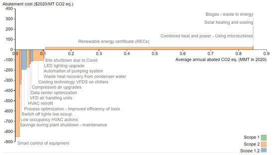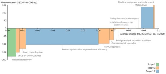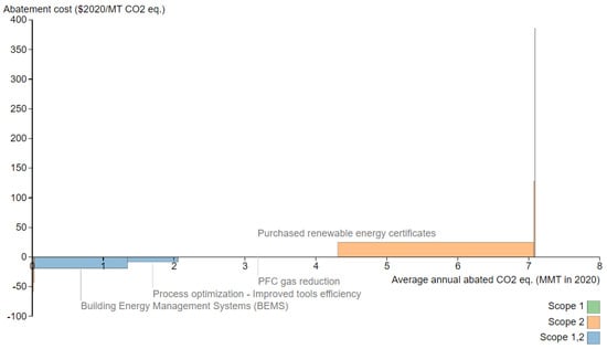 Based on the CDP data of six companies, MACCs were developed to analyze the technologies based on the respective costs for abating each mass unit of CO2 in terms of US dollars per metric ton of abated CO2 eq. The MACCs for Intel, Samsung Electronics, and Micron are shown in Figure 14, Figure 15 and Figure 16, respectively, and the MACCs for the remaining companies are provided in the Supplementary Materials.