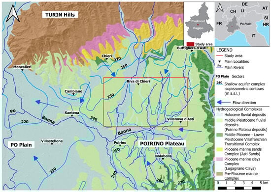 Map of the study area in the Piedmont Region (NW Italy), hydrogeological complexes and piezometric surface of the shallow aquifer in the Poirino Plateau (summer 2016) (modified from [31]).