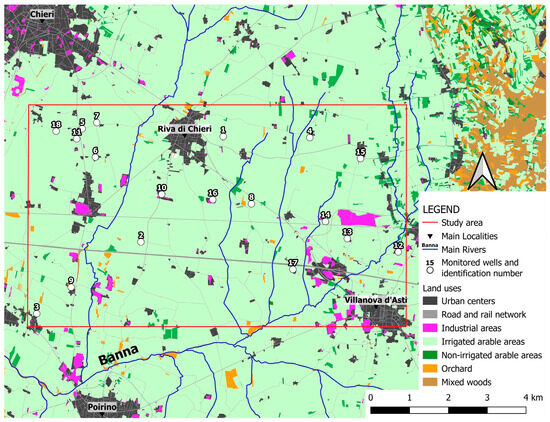 The Poirino Plateau (northwestern Italy) presents high contamination of the shallow aquifer due to intense agricultural practices and industrial activities; the latter have mainly existed in the second half of the 20th century, with repeated exceedances of regulatory limits [28]. This sector constitutes a rural area where the aqueduct network does not reach a high number of isolated homes. In these contexts, deep wells used for drinking water purposes are often mixed with polluted shallow aquifers. Moreover, many people exploit numerous shallow wells for personal purposes, such as personal hygiene, domestic uses and market gardens. Nitrogen pollution shows variable concentrations in spatial and temporal distribution [29], typical of areas with a high degree of pollution [30].