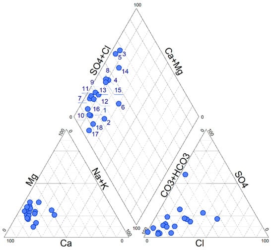 In the Piper diagram (Figure 3), a large number of sample points plot within the calcium–bicarbonate facies, while only three samples plot within the calcium–chloride–sulfate facies. These three samples (nos. 3, 5 and 14) correspond to the samples with the highest electrical conductivity samples. The cation triangle shows low variability between samples, with a Ca/Mg ratio in favor of Ca. Reverse situation in the anion triangle with a ratio in favor of HCO3 and an influence of Cl.