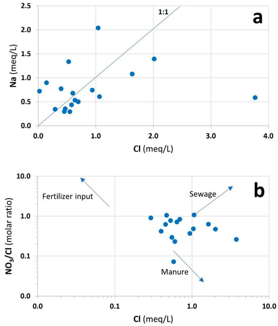 The molar ratio diagram of Cl/Na (Figure 4a) highlights a good correlation, showing a ratio of approximately 1, with only one sample with a ratio in favor of Cl (sample no. 3). The mixing diagram with the NO3/Cl ratio and Cl (Figure 4b) suggests an anthropogenic origin of NO3 and Cl, related to sewage and manure inputs.