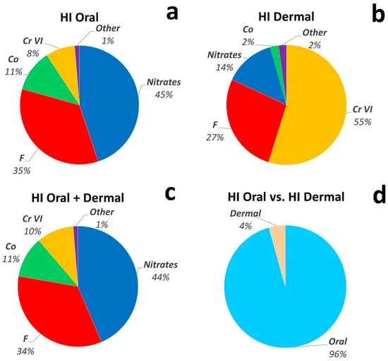 Average of the estimated noncarcinogenic risk for the 18 samples divided by substances and exposure: (a) HI oral; (b) HI dermal; (c) HI oral + dermal; (d) HI oral vs. dermal.