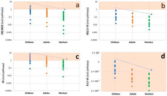 Exceedances of carcinogenic and noncarcinogenic risk limits for oral exposure divided by receptors: (a) HQ NO3; (b) HQ Cr(VI); (c) HI oral; (d) R Cr(VI). Risk fields in orange.