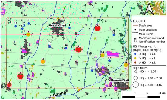 Representation of the comparison between HQ NO3 and regulatory limit for children’s oral exposure. r.l.: regulatory limit., HQ maximum permissible value: 1. (Legend of the land use background is the same as in Figure 2).