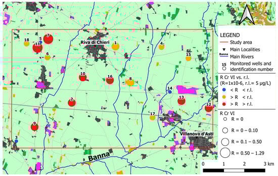 Representation of the comparison between R Cr(VI) and regulatory limit for children’s oral exposure. r.l.: regulatory limit. R maximum permissible value: 1 × 10−6. (Legend of the land use background is the same as in Figure 2).