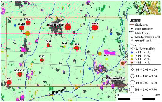 The threshold values imposed by the Italian legislation [24,25] and the exceeding of the thresholds by the concentrations detected are highlighted in Table 1. In order to highlight the potential situations of risk for the population in the case of exceeding and not exceeding the regulatory limits, three maps were created (HQ NO3, HI, R Cr(VI)). NO3 and Cr(VI) were chosen because they were the compounds with the greatest contribution to the noncarcinogenic and carcinogenic health risks, respectively.