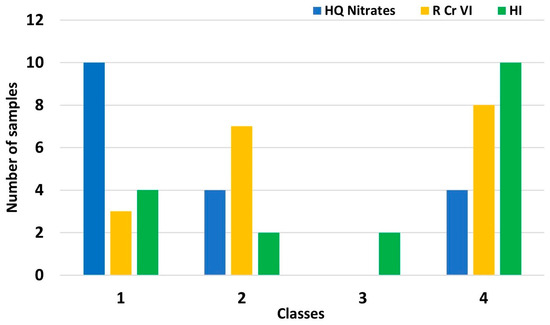 Regarding the noncarcinogenic risk for the cumulative of noncarcinogenic substances (Figure 9), 12 samples show concentrations above the regulatory limits, with exceedances for NO3, F and Cr(VI). In the opposite condition, four samples show concentrations below the regulatory limits and HI below the unit. However, four samples are in the transition conditions corresponding with concentrations below the regulatory limits but HI above the unit (nos. 6, 14) and concentrations above the regulatory limits but HI below the unit (nos. 13, 16). The exceeding of regulatory limits in the transition condition are in reference to Cr(VI) while the exceeding of units for the HI are in reference to NO3. Therefore, 12 samples were identified as unacceptable according to the regulatory limits and with the health risk assessment, 2 samples were added for a total of 14 samples to be identified as unacceptable.