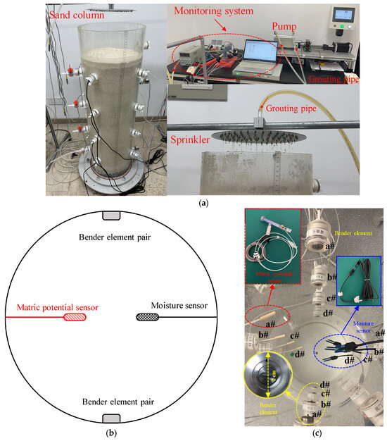 Sand column design and sensor placement. (a) Sand column; (b) schematic diagram of sensor layout; (c) actual sensor layout. (the marks a#, b#, c#, d# show that the sensor is 8, 28, 48, 68 cm above the bottom of the sample, respectively).