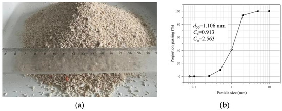Experimental material. (a) Calcareous sand; (b) particle size distribution.