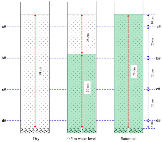 Schematic diagram of different water level heights in sand column (the marks a#, b#, c#, d# show that the sensor is 8, 28, 48, 68 cm above the bottom of the sample, respectively).
