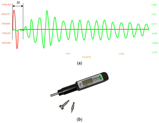 Four pairs of bender elements were installed at four positions on the transparent cylinder wall, and the distance between the two probes of bender elements was 30 cm. A sine wave with a frequency of 5 kHz and an amplitude of 10 V was excited and received by the bender element. As shown in Figure 4a, red and green waveforms represented excited and received waves, respectively. According to the “start to start” method [32], the propagation time Δt of the shear wave within the range of 30 cm was determined to calculate the shear wave velocity.