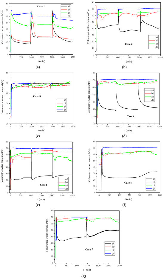 Evolution of volumetric water content over time in (a) Case 1; (b) Case 2; (c) Case 3; (d) Case 4; (e) Case 5; (f) Case 6; (g) Case 7.